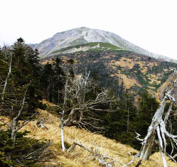 | 森林限界を超えて、ザラついた稜線に出ると、左横方向からの風に乗って「ガス」が押し寄せ、メガネの左一方だけに水滴が溜まり、視界を遮る為に「メガネ」を外した。 高度を上げるに従い、視界距離が下がる。 6時40分に「小聖岳(2662m)」を通過。 暫くガレた稜線(左側は谷への急激な斜面)に沿って歩くと、いよいよ「聖岳」山頂への急坂が始まる。 ガレたジグザグの斜面を「小雨・ガス・横風」の悪条件の中を息を弾ませて登り続けた。 徐々に左方向からの風で「雨具のない左パンツ」から水が素肌に感じられ始めた。 2-3回の5分間休憩の合図で止る。 歩行をとめると次第に「手」に冷たさがしみてくる。 7時30分過ぎに「2羽のライチョウ」が登山ルート側まで出ていた。 既に95%以上の毛が白く「冬支度完了」の状態だった。 人間との距離を上手に2m−3mあけては止まり此方を見る。 写真撮影したい衝動に駆られたが、ゴアーの雨具の下に背負っている「ナップザク」 からカメラを取り出して撮影する気になれなかった。 去年の岩手山登山で同様の「風とガス」の条件で使用したために故障した経験がその選択を強いた。 1-2分観察して、聖岳頂上を目指した。 |