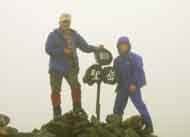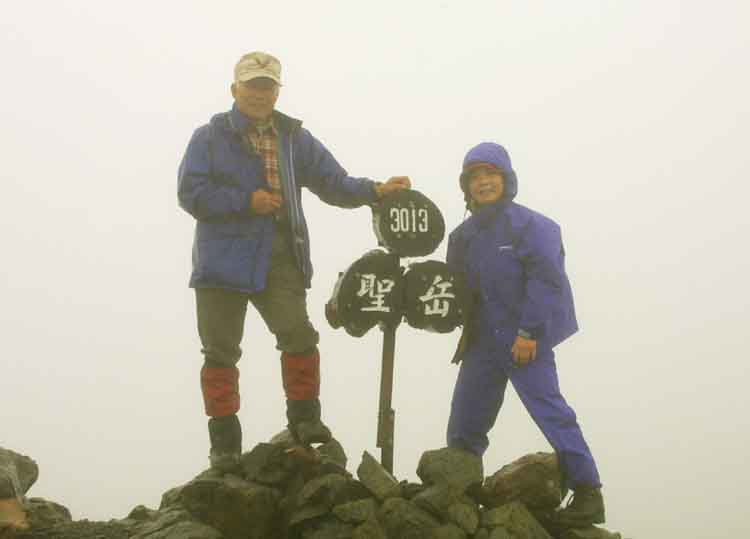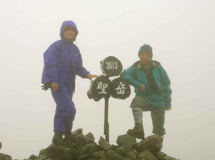| 間もなくガスで全く視界の利かない聖岳山頂(3013m)に到着。 既に4-5人のパーティーが山頂標識で記念写真を撮っていた。 強くはないが「冷たい風・小雨・ガス」が混じり、立ち止まると体中が冷える。 手早く「カメラ」を取り出して、先行した「羽田氏・山崎さんの記念写真」、続いて「山崎さん・殿川の写真」を撮影してすぐザックに収納して、カメラの水濡れを防止した。 パンとチーズの軽食を立ったままで済ました。 松倉氏と山崎さんから「カステラ・果物」を差し入れてもらって、空腹が収まり体温も上昇したが、濡れた手袋の手先の感覚が鈍くなり始め、雨具下のシャツにも冷たさが強くなった。 霧雨のために、登山〜下山までの写真は、上記の「2枚」だけだった。 |