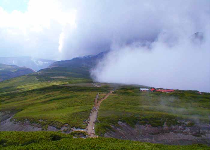 | 昼食と果物・フランスパンをコンビニで購入。 16時10分のロープウエイ乗車までの2時間余で縦走の最終装備の確認・パッキング・ビジターセンターでの天候・縦走ルート全般の情報入手で忙しい時間を過ごす。 7月20日に下山後、JRを乗り継ぎこの層雲峡駐車場に戻り、キャンピングカーを回収して、知床方面に回るプランである。 小屋の宿泊で満員になりやすい白雲避難小屋のためにはテント持参がk好ましいが、>25キロのザックには不可能に近く、持参せず最悪(満員)の場合は小屋の軒下で「ツエルト利用」を決めて、約2キロを減量。 計画は、黒岳石室・白雲岳避難小屋・ヒサゴ沼避難小屋での宿泊の「3泊4日」だが最悪では「5ー6泊」も可能な食料を担ぐ為に多分25キロ・プラスの重量のザックとなった。 大雪縦走は各小屋で良質の水が得られるから心配が少ない。 天気は時間とともに雲が低くなり天気予報よりも早い悪化傾向を示していた。 16時車をロックして、ロープウエイ駅に向かう。 定員の半分くらいの観光客の殆どは黒岳リフトまでの往復のようだ。 黒岳リフト駅では終に小雨が降り始めた。 雨に濡れながらの15分間は下山者から大きい荷物を見てか励まされた。 登山届を提出して、ゴアー雨具を取り出し、パッンキングの修正(カメラはザック内に収納)。 ロープウエイ(片道):¥900、リフト:¥400。 17時10分出発。 >25キロのザックで雨の中の出発は、とても気が重い。 2−3組の登山者はもう先に出発した。 どうも小生が最後の登山者のようだった。 不規則な大きい石の階段状の登り道は厳しく、北海道に入って最初の宿泊・縦走登山で荷物の重さは予想以上に足にきた。 幾ら頑張っても、15分毎に5分休憩が最速のペースになった。 途中で追い越した中高年の夫婦にも先行を勧めた。 17時45分八合目到着。 雨は徐々に強くなるようだし、暗くなる前に石室到着の心配も現実味を帯びてきた。 左手方面に、ローソク状のとがった岩を探すも確認出来なかった。 18時35分、小雨降る黒岳山頂に到着してほっとした。 |