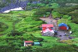 展望はあまり良くないが、残る行程は下りの10分間の辛抱だ。 5分休憩して気合を入れて濡れたカバーのザックを担ぎ挙げた。 少し気持ちのゆとりが出て、ガレ下り道脇に2−3種類の「高山植物」がガス越しに見えた。 18時50分に黒岳石室到着。 管理人に宿泊を告げて重く傾いた「木製扉」を押し開く。 既に内部は暗く、「イビキ」さえ聞こえた。 今夜の宿泊料¥1,500を支払い2段ベット構造の上部にスペースを確保。 ほぼ20−25名位の宿泊者数だ。 登山道中に全く写真撮影をしなったのは初めて・・・。 そんな余裕は全く無かった。 上記2枚の写真は、今日の撮影でないが左の写真は山頂からのお鉢平や黒岳石室方面の展望であり、右のは桂月岳から石室を見下ろした展望だ。 左手、上方に黒岳が位置する。 写真ゼロではさびしいので2枚掲載した。 直ぐ夕食用食材・ヘッドランプ・バーナー・コッヘル等を取り出し、夕食準備を急ぐ。 定番メニュー+コーヒー+果物(プラム)。 20時15分夕食終了。 外の雨は更に強く風の混じってきた。 間違いなく明日の天気は良くない。 >25キロのザックで疲労困憊して、20時30分までしか記憶が無く直ぐ熟睡に入ったらしい。 |