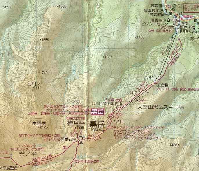 | 層雲峡ロープウエイ駅〜リフト〜八合目〜黒岳山頂 |