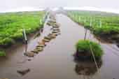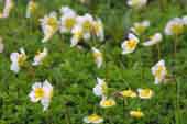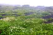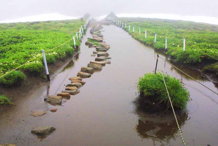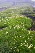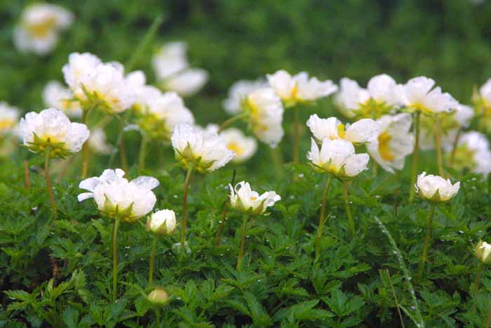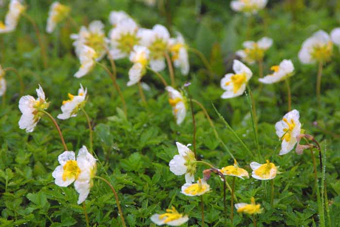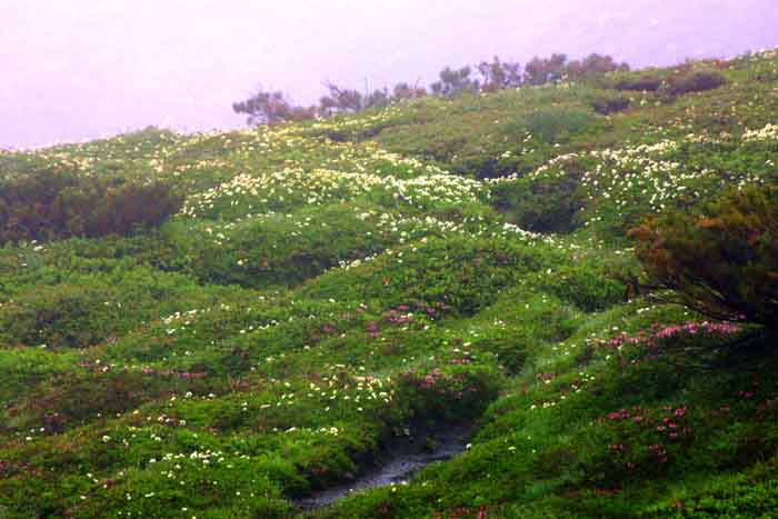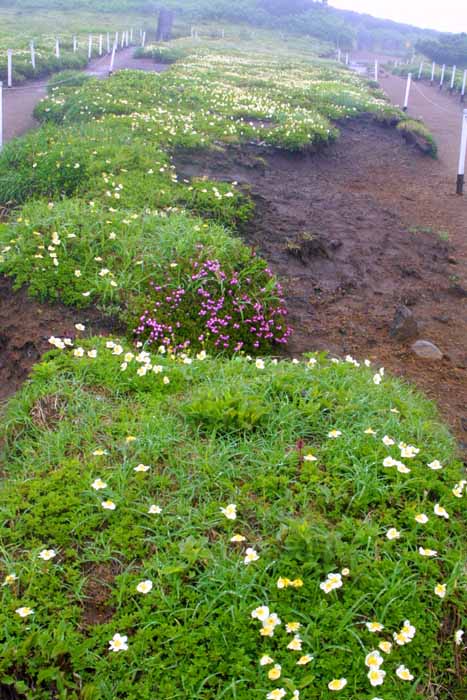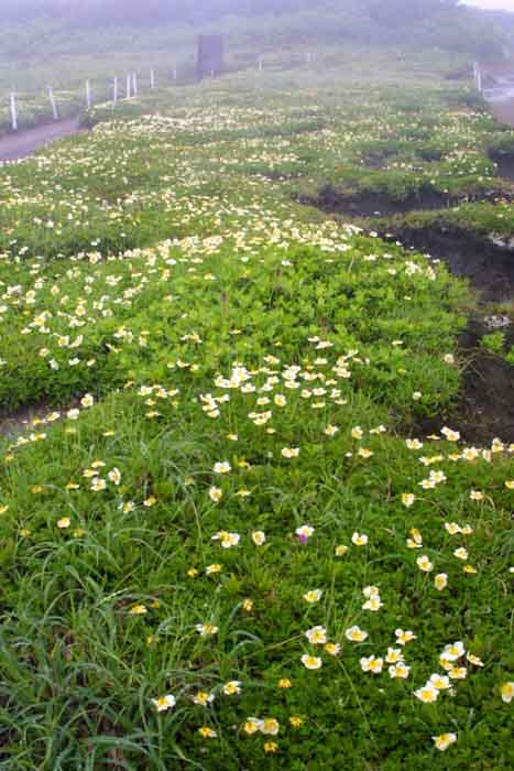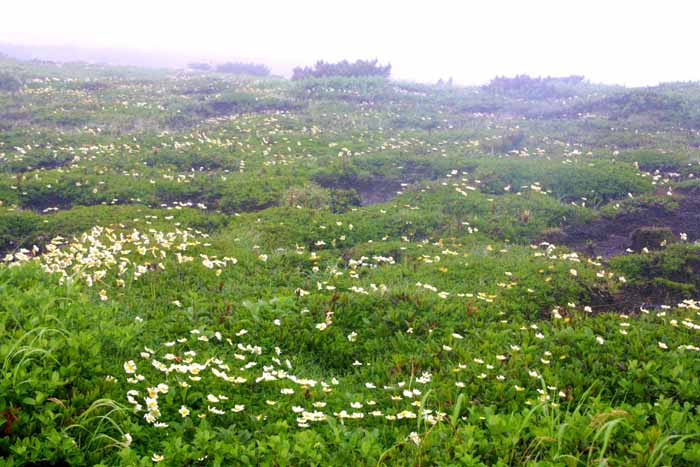 | 9時頃以降から風雨が弱くなったので、10時から10時30分頃まで石室周辺100m以内で、傘をさして、風景・高山植物撮影に出た。 視界は50mがヤット・・・。 黒岳の方向からの巾約2mの小道には一面に水が溜まり、盛り上がった他の場所には、昨夜来の強風雨に痛めつけられ「チングルマの花弁」等を撮影した。 石室入り口の風よけ用石積壁の隙間にも白い可憐な花を見つけた。 |