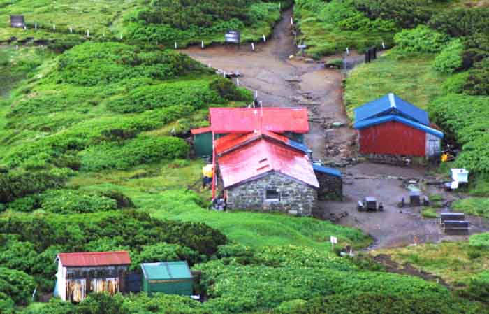 | 朝5時目覚め。 夜中の強風・雨の為に何度も意識が戻りながらもシュラフに包まっていたが、4時頃からざわざわし始め、朝立ちの登山者の行動開始の物音と会話だ。 特に強風雨のために予定行動を取るるべきか、ルート変更か、石室内に滞留するかの会話が中心だったので普通よりも騒がしかった。 種々の登山者の会話を総合すると「勤務都合」で下山予定変更出来ず、強風を避けうるルート変更を管理人に示唆さて出発したグループが大多数で午前6時には数人を残すのみだった。 ラジオでの天気予報を何度も聞いて、昨夕小生より先行登山した中高年夫妻は小生と同様に1日延長して石室に滞留した。 |