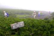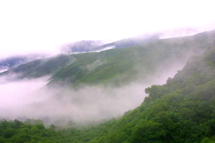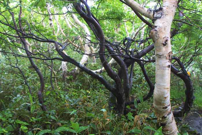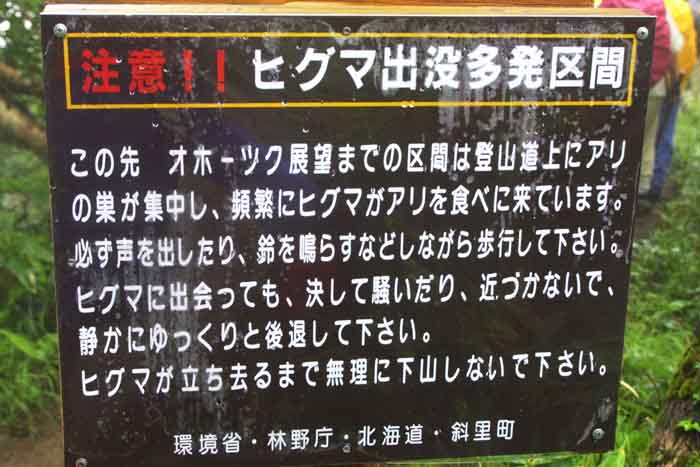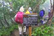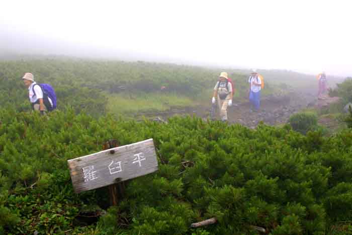| AM5時前に目覚めたが、やはり小雨・霧に包まれていたが、大雨でない限り、登山する決心で起き上がる。 しっかり「朝食」を摂って、傘も持参して、木下小屋の「阿久津氏」を訪ねた。 約束していた「予想以上に大きいおにぎり、2個入りの包みを受け取り、登山届に記入後、5時50分、登山開始。 開始早々樹林帯に入り、急坂が始まった。 2日間の休養した足も、雨で滑りやすい登山路は歩きにくかった。 誰も登山者を見かけない。 約1時間で平地となり「オホーツク展望」の良い地点だが、霧・小雨で視界は絶望的。 其の付近には「オトギリ」「マルバノイチヤクソウ」「エゾノヨツバムグラ」等の高山植物と巡り合う。 小雨を避けるプラスチックバックで覆ったカメラを出し、手持ちでの撮影は、予想以上に暗く、ISO感度を1600に設定しても「手ぶれ限界以下のシャッター速度」しか得られない。 其の覚悟で「ムリヤリ」に撮影(下山後に予想通りの手ぶれの画像を確認)。 「560m岩峰」を過ぎると「熊注意」の看板が有った。 阿久津氏は話した「熊野巣地帯」を通過中を知る。 兎に角「物音」(ベル・ホイッスル)を立てて、なるべく早く其の地域を脱出せよ!!のアドバイスを忠実に実行。 息を弾ませて無事通過。ダケカンバ地帯を過ぎると「弥三吉水」の標識。 登山ルート中で最も確実な「給水地点」だそうだ。 右手の木の下に豊富な水流があったが、「北海道の疫病:エピノコックス」を警戒して、全ての水(2.5L)は車から担ぎあげたので、給水の心配は無い。 テントも「3−5張」ほどのスペースもあった。 此処からやや平坦な道となる。 「極楽平」と命名されている。 「仙人坂」にさし掛かるとジグザグの急坂となる。 8時過ぎに「銀冷水」の標識点に到着。 小休止して霧の中の登山を継続する。 大沢の低部のガレ場を登る。 左右に、「エゾツツジ」の群落が見事だ。 「一の岩」「二の岩」を通過の時に、初めての登山者に追いついた。 4人組の中年女性だった。 4人のペースが遅いので、先行させてもらう。 急坂の最終点で、霧の中に下山して来た「大阪市在住の中年男性」とすれ違う。 羅臼岳山頂の情報を得たが、案の定「全く視界なし」「風もあり寒い」との悲観的の話だけで、急いで下山して行った。 直ぐハイマツが一面の「羅臼平」に到着。 右手に「羅臼岳(1661m)」、左手に「三ッ峰(1509m)」,正面は羅臼温泉からの登山口方面だが、何れも視界が無く真っ白の世界。 風は感じられない静けさだ。 |
