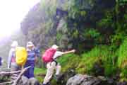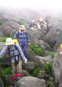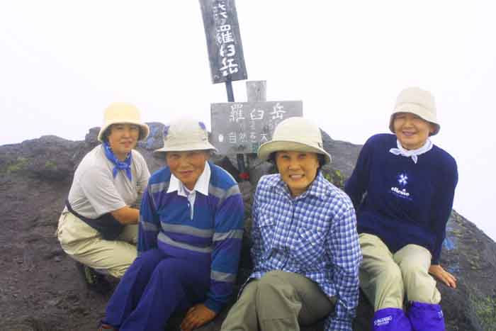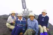 | 山頂標識の前での記念写真 | 山頂直下部の溶岩ドームでの下山 | 高度の低下で視界も良くなる | |