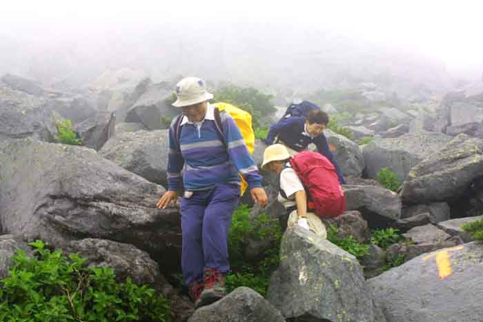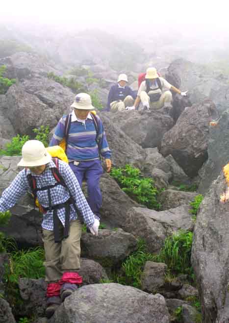 | 巨大な溶岩ドームからなる「羅臼岳山頂」の下りは大きい石の間を縫うように進む。 再び「岩清水」の苔むした岩と白糸の如き清水の美しさに見とれた。 羅臼平を12時に通過、 仙人坂までの大沢のルートは小石と雪渓の雪が混じり滑りやすかった。 雨は降らないが相変わらず、視界は悪い。 12時45分に銀冷水、 13時10分に弥三吉水を休憩せずに通過。 この頃から小雨が降り始めた。 傘をさひても歩ける状況で、ゴアーの雨具を着用せず。 山形からの4人は次々と「学校唱歌」・「流行歌」を歌い、時には「輪唱」も入る楽しい下山路を楽しませてもらった。 「560m岩峰」手前から「熊注意」の看板(写真左下2枚)が見え、一段と4人の歌声は高くなった。 熊も木陰で静かに聞いていたかもしれない。 ダケカンバ帯から混合樹林帯に入ると雨も多少強まり、粘土質の登山路には水が各所にたまり、大変すべり易くなった。 休憩場所も無い事もあって、「無休」での歩行が続く。 樹林帯のルートの下で「黄色の大きいキノコ群」を発見。 山形の4人は植物・キノコにも知識が豊富で「ヒグマが最も好むキノコ」だと知った。 登山口の近くの「祠」で安全登山が出来た事を感謝をささげて、15時40分、木下小屋に到着。 下山所要時間=4時間20分。 直ぐ「阿久津氏」に山頂と状態と美味かった「オニギリ」のお礼を述べた。 |
