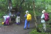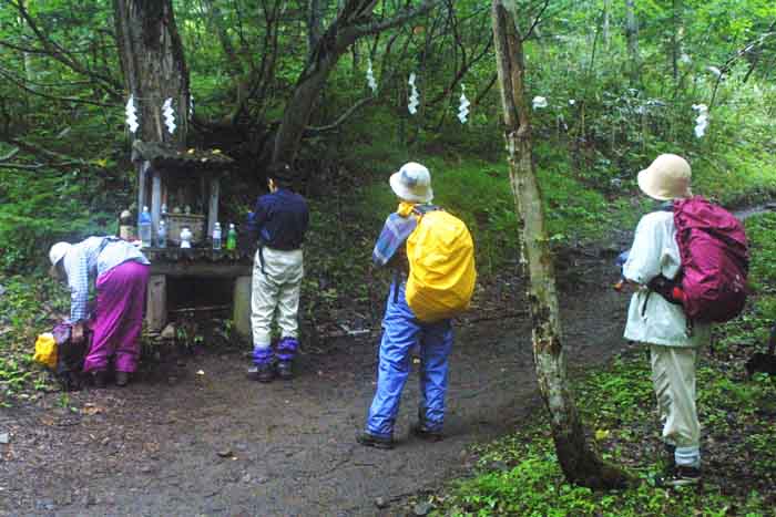 | ヒグマ出没多発地帯の看板に緊張!! | ダケカンバの白と黒の樹皮 | 登山口近くの祠に感謝 | |