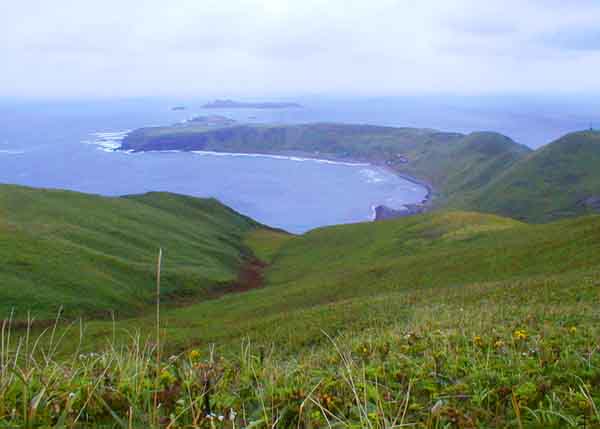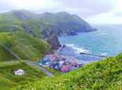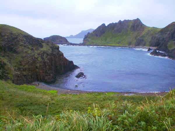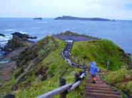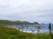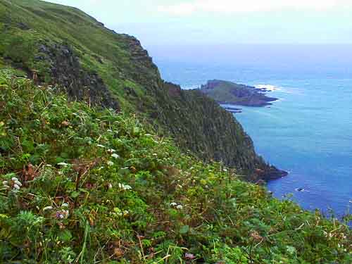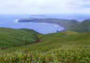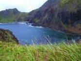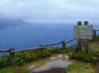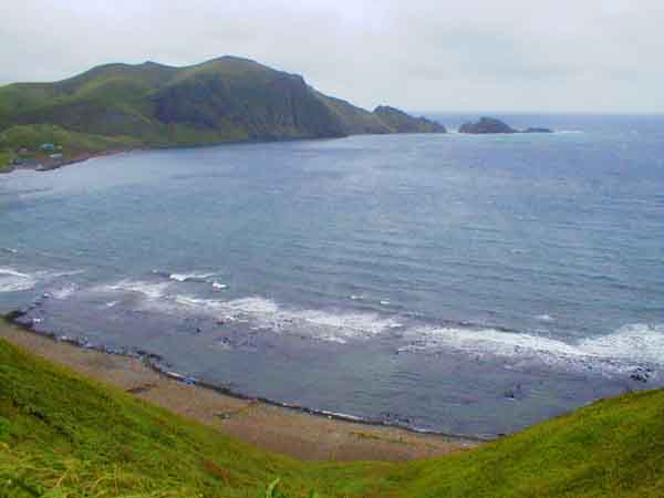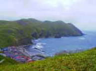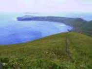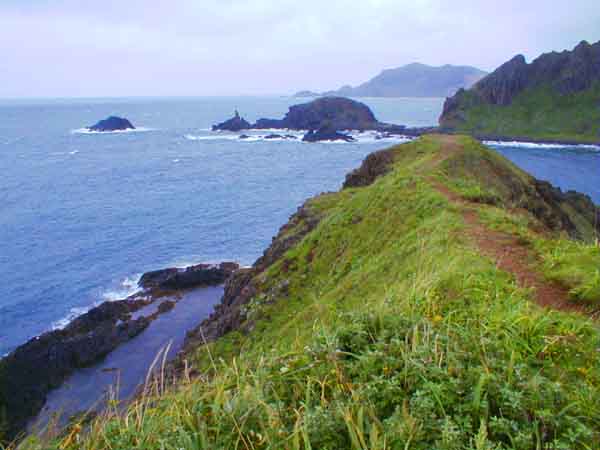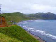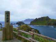 展望台から降り、14時30分頃「西上泊部落」に到着。 バス停留所の側のお店の電話から民宿に電話して「出迎え」を依頼した。 そん間の時間を利用して部落の先の「澄海岬」に行く事を勧められた。 5分で狭い岬への道を抜け、素晴らしい展望台「澄海岬」にでた。 手前に険しい岩のある「稲穂岬」、その向こうには、霞んだ「ゴロタ山」「ゴロタ岬」が見えてしてこのルート最大の展望スポットだった。 この小さい入り江は波も無く「青い池」に見えた。 10分余を過ごし、急いで予約した「民宿の車」がくる15時までを意識してバス停留所に戻り、島の牛乳を飲み喉を潤した。 |