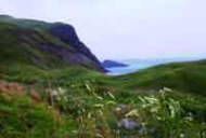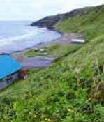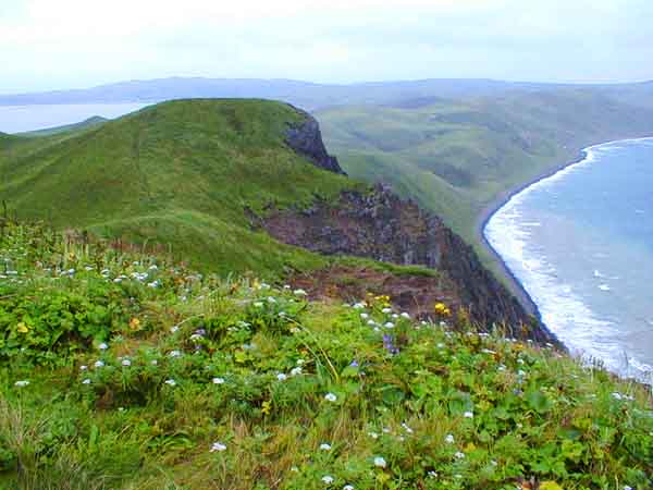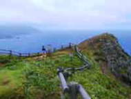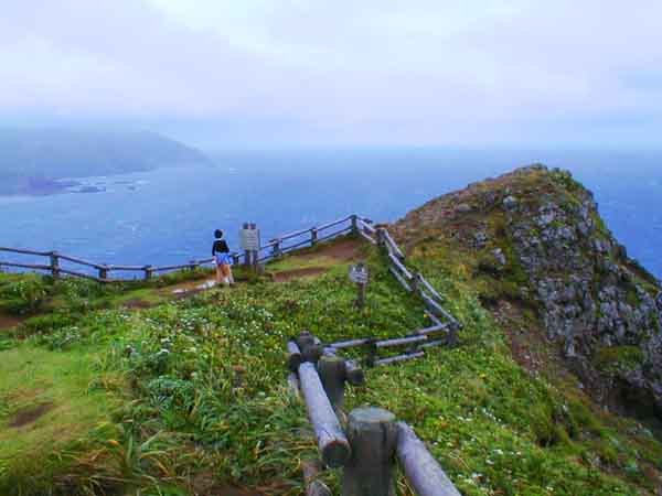 ゴロタ山(179m)登山口に11時30分到着。 急坂を登り丘に出ると先ほど通過した「鮑古丹の浜」が弧を描く様が見える。 若い一人の女性が先着していたが、同じ「4時間コース」を辿るのだろうか・・・。 前日の雨がこの地域は強かったのだろうか水溜りが残っていた。ゴロタ山からはアクセス不能だが、先端部は急な崖で海にせり出して「ゴロタ岬」を形成している。 この山頂からは北は「スコトン岬」「トド島」・南は「西上泊海岸」、その南の「召国ノ岬」もかすんで見えた。 晴れていればサハリンも展望可能らしいが、雲が低く勿論見えない。 |