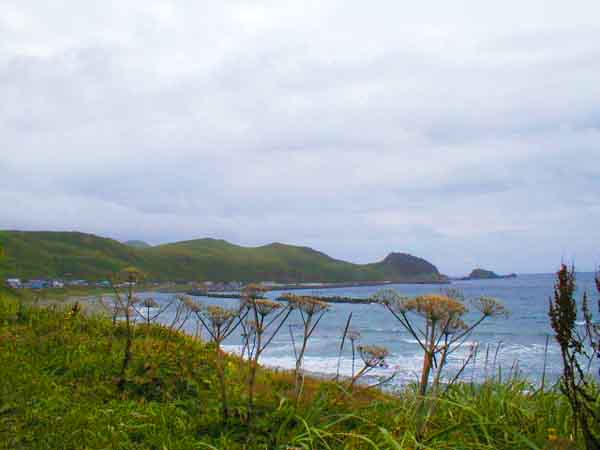 番屋の周りの岩の隙間には小さい「レブンイワレンゲ」が一杯生えていた。 岬から景観荘等の民宿の側を抜けて南下しながら「鮑古丹」の浜に向かって進む。 途中には「ツリガネニジン」が早くも咲き始めていた。 一番多い花は白い「エゾノシシウド」等のセリ科植物だ。鮑古丹の浜に向かう車道には植物も少なかった。 |
