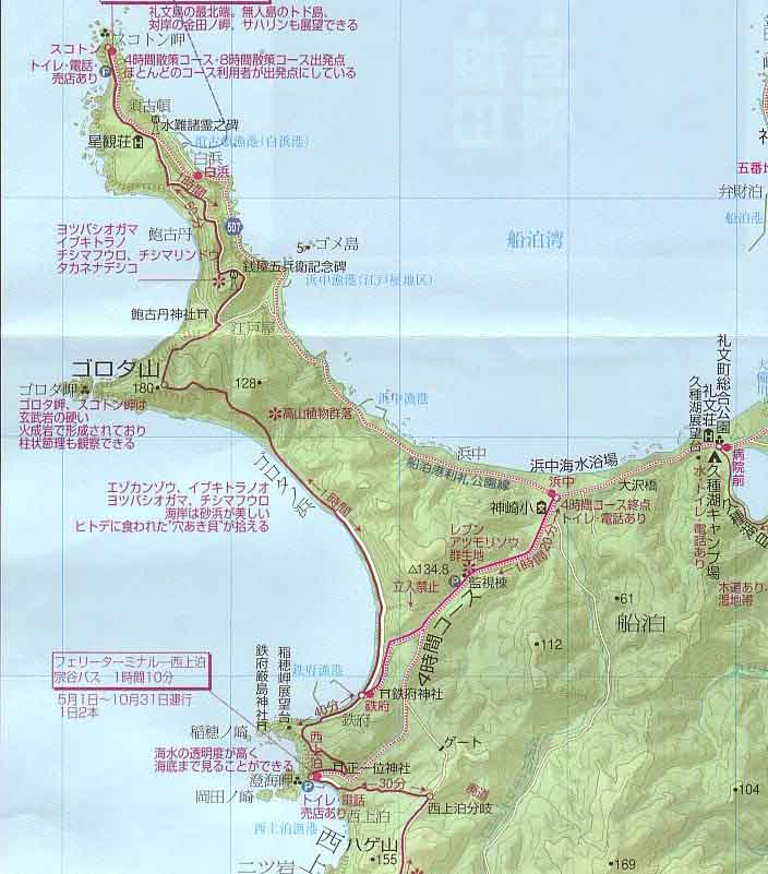 | 14時45分と早く到着した民宿の車で民宿へ。 15時に民宿到着し荷物のパッキング作業を開始。 15時30分から新聞を読みPCの画像をスライドショーで鑑賞して16時25分のバスの時間まで休憩。 船泊発16時25分の定刻に出て、礼文島東海岸にそって走る。 山側の崖には幾種類もの高山植物が花をつけていた。 16時50分香深港に着き、フェリー切符の購入。 17時25分出航。 船室は50%以下の乗船客だ。 其の中の若い男性(学生?)が見ていた「礼文:花の島・花の道」(北海道新聞社発行)のタイトルの小冊子には【礼文島の花】が詳しく記載されていたので船内の売店で購入。 今回は民宿が満員で登山できない「利尻:山の島・花の道」(同新聞社発行)も入手した。 100ページ弱の「B-5」版で高価(¥1,100)だが、写真も多く価値は高い。