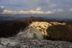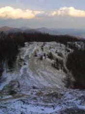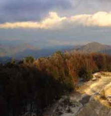 |  <西陽に照らされた奥多摩小屋方面> (山頂避難小屋からの眺望) |