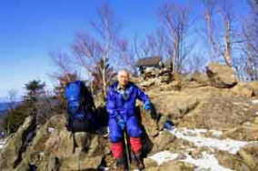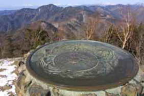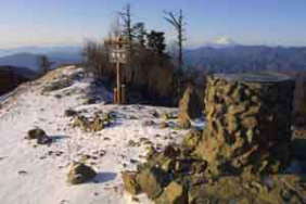 約30分間、山頂からの360度の眺めを楽しみつつ、富士山、両神山、笠取山、甲武信ヶ岳、大菩薩嶺等の展望を写真に収める。 特に昨日夕方見えた「鴨沢コース」の登山路に沿った稜線の雪と林が朝の陽光に照らされ、そのコントラストが見事だった。 昨日の雨で濡れた雨具、帽子、手袋等がすべて凍結してバリバリ状のものを太陽光に当てるため外に出す。 |
