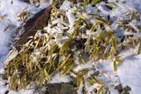 | <山頂ほ方向表示版> | <避難小屋から雲取山山頂を見上げる> | <昨日の雪を被った熊笹> |