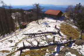 | <雪に覆われた山頂> | <山頂の方向標識> | <山頂から避難小屋> |