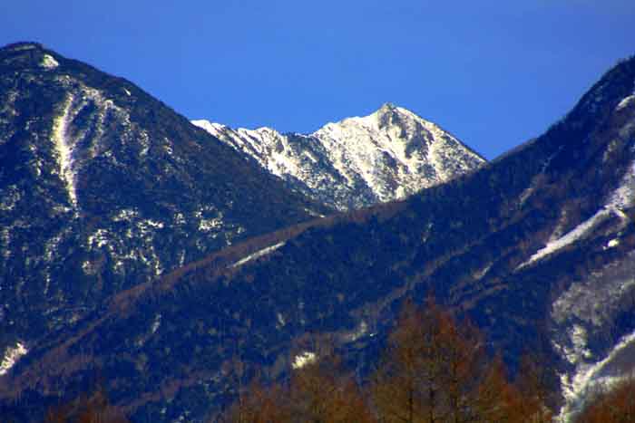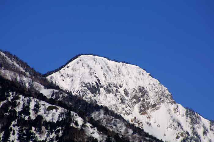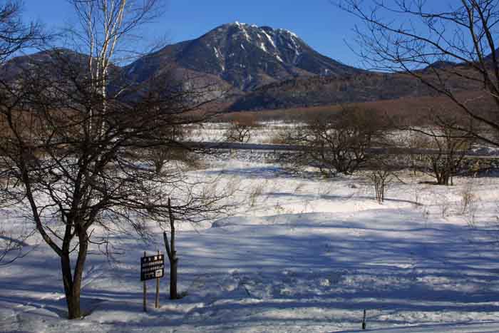 | 再び「シラカバと日光連山」を組み合わせて撮影後、12時30ぷんに出発。 左手は綺麗な大きい唐松林を過ぎて、「西湖」方面の分岐点を「泉門池」方面に向けて前進。 その辺から樹種が「唐松」から「ミズナラの原生林」に変った。 湯川に沿う「泉門池」(鴨がいる綺麗な池)のルートを避けて、戦場ヶ原の中心を縦断するルート辿り「戦場ヶ原中心部」から周辺を眺めるコースにした。 踏み後を外すと片足を踏み抜く事が多かった。 勿論近くには「無雪期用の木道」はあるはずだが、雪を被り全く見えない。 好きなコース取りでゆっくりと歩く。シラカバ林を抜けると一面が広大な湿原が広がる光景の背後には「雪を被った日光連山」が湿原の番人の如く取り囲んでいる。 残念ながら「奥白根山」「前白根山」は手前の山並みに遮られて見えないが正面・左前方には左から「太郎山」・「子真名子山」と「大真名子山 」に挟まれて僅かにひと際目立つ純白の山頂部のみを出している「女峰山」、その右に戦場ヶ原の名主「男体山」が迫る。 雲も少なく「「青い空」と言うよりも「紫か黒紫の空」2見える。 快晴の高い山で見えられる「あの空の色」だ。 雪原と空の明るさの差異が大きすぎてい一枚の写真での纏まりが難しい程だ。 天空は黒く、地面は純白。 凄いコントラスト!! 湿原中央部には「幼木」もなく「葦」が1−2mの雪原に上部を出している部分がまた美しいが、撮影では露光調整で気を使う。 赤沼茶屋駐車場近くで「幅を広げた湯川の水面に写る男体山」を見ようと不注意で川岸に近寄り、腰まで雪に沈み脱出にかなりの運動を強いられた。 でも素晴らしい写真を物にした。 |
