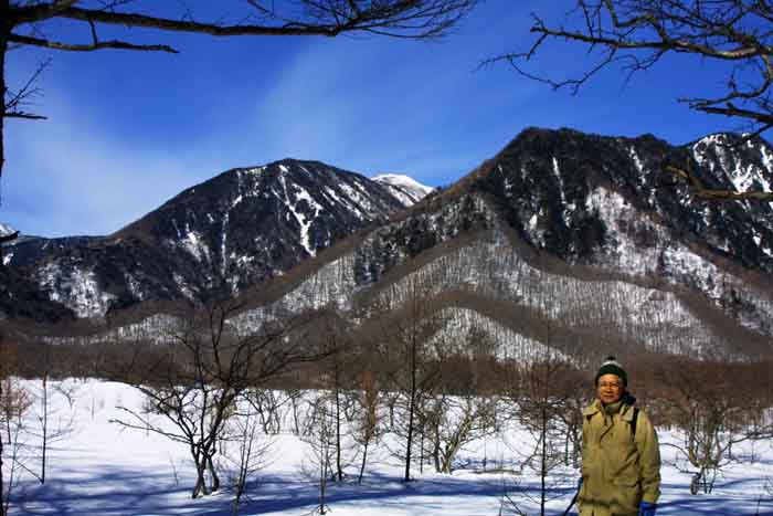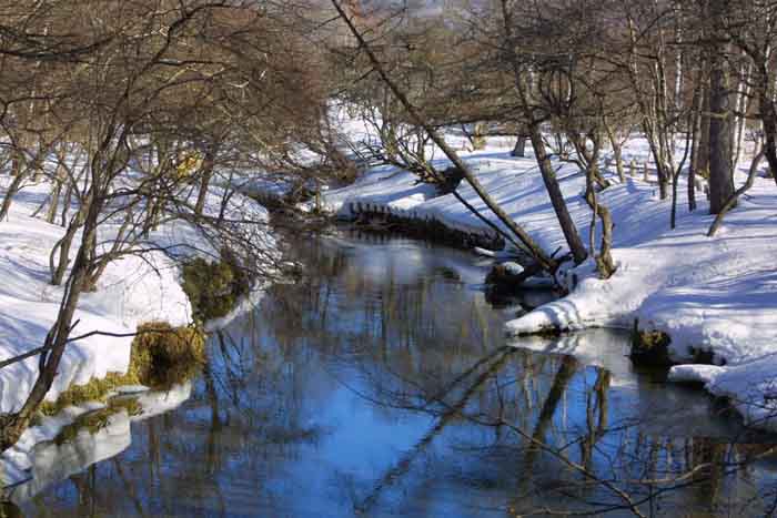 | 赤沼茶屋駐車場で「ワカン」「防寒ブーツ」防寒パンツ・ジャケット」を付け「サングラス」「帽子」と完全装備で9時30分に出発。 稀に見る絶好の快晴だが外部の気温はかなり低い。 雪面からの反射を考え「サングラス着用。 「ストック(一脚兼用)」「デイバック」(コッヘル・バーナー・燃料・食料・水筒)まで加えると総重量は7−8キロを超過しそうだ。 十分な時間もあり、時間を掛けて写真撮影出来そうだ。 小田代原歩道沿いのミズナラ林が朝日の斜光で一本一本の幹の影が美しいコントラスト。 何時もで見ても見飽きない。 雪面の質感も忘れられない純粋さが感じられる。 「石楠花橋」方面を左に分けて「木製橋」を渡る。 数段の階段には残雪が凍結して最深の注意で通過。 その橋の上から見下ろす「湯川」は「黒いミズナラの樹皮と純白の雪」青い水面に写る光景の中々のもの。 |