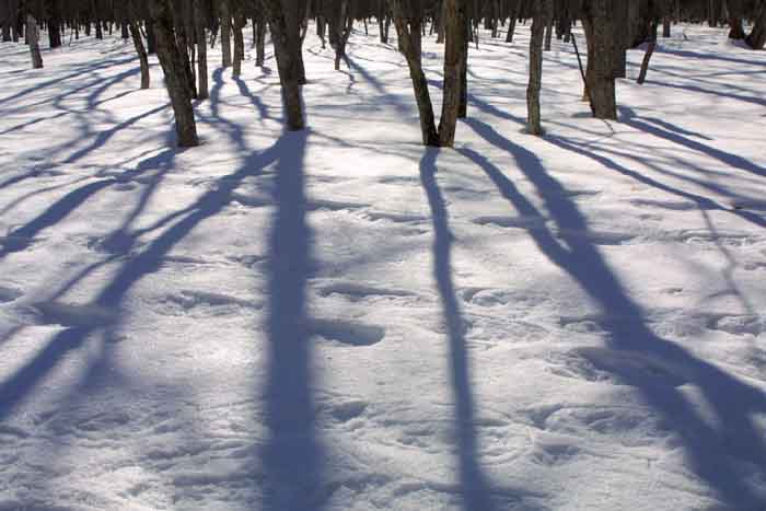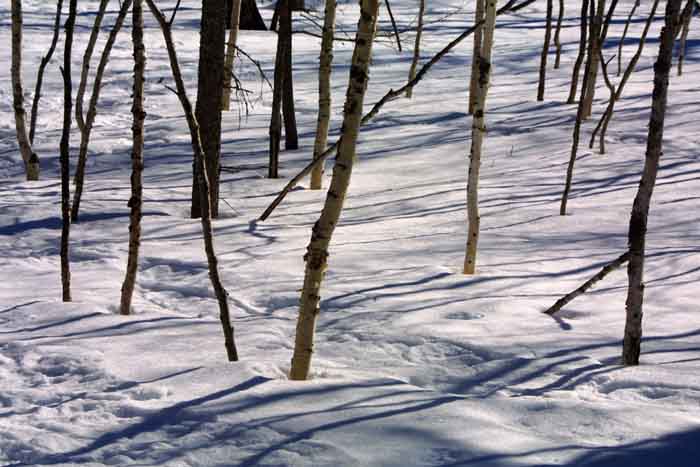 | 純白の雪面に落とす朝日の木影を見ると上部も見ないで「樹種・木々の太さ・高さ・密度」等を推定できる。 雪面が景色の主役を演じる。雪面の質感が表現の仕様のない美しさである。 足跡をつけて内部に入ることに罪悪感を感じる程だった。 |